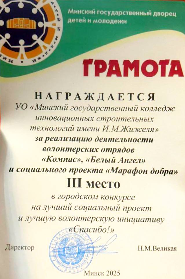 Колледж инновационных строительных технологий им И.М.Жижеля, занял III место за реализацию деятельности волонтерских отрядов «Компас» и «Белый ангел», а также реализацию благотворительного проекта «Марафон добра».